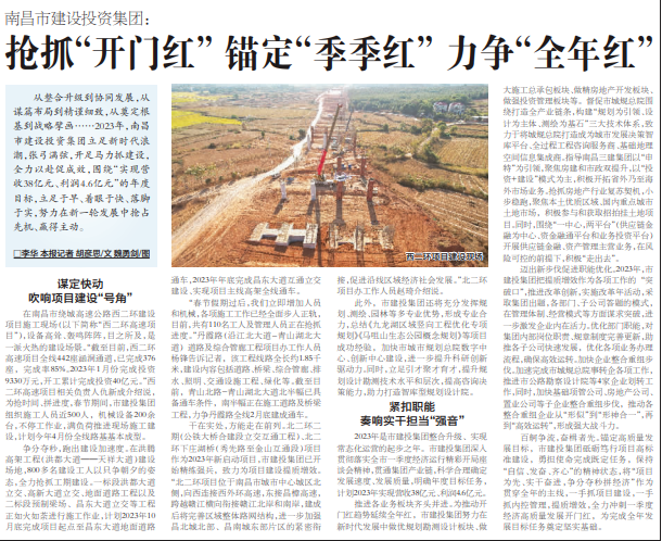 從整合升級(jí)到協(xié)同發(fā)展,從謀篇布局到精謹(jǐn)細(xì)致,從奠定根基到戰(zhàn)略擘畫(huà)……2023年,南昌市建設(shè)投資集團(tuán)立足新時(shí)代浪潮,張弓滿弦,開(kāi)足馬力抓建設(shè),全力以赴促成效,圍繞“實(shí)現(xiàn)營(yíng)收38億元、利潤(rùn)4.6億元”的年度目標(biāo),立足于早、著眼于快、落腳于實(shí),努力在新一輪發(fā)展中搶占先機(jī)、贏得主動(dòng)。 吹響項(xiàng)目建設(shè)“號(hào)角” 在南昌市繞城高速公路西二環(huán)建設(shè)項(xiàng)目施工現(xiàn)場(chǎng)(以下簡(jiǎn)稱“西二環(huán)高速項(xiàng)目”),設(shè)備高聳、轟鳴陣陣,目之所及,是一派火熱的建設(shè)場(chǎng)景?!敖刂聊壳?,西二環(huán)高速項(xiàng)目全線442座涵洞通道,已完成376座,完成率85%。2023年1月份完成投資9330萬(wàn)元,開(kāi)工累計(jì)完成投資40億元。”西二環(huán)高速項(xiàng)目相關(guān)負(fù)責(zé)人仇新成介紹說(shuō),為搶時(shí)間、拼進(jìn)度,春節(jié)期間,市建投集團(tuán)組織施工人員近500人,機(jī)械設(shè)備200余臺(tái),不停工作業(yè),滿負(fù)荷推進(jìn)現(xiàn)場(chǎng)施工建設(shè),計(jì)劃今年4月份全線路基基本成型。 爭(zhēng)分奪秒,跑出建設(shè)加速度。在洪騰高架工程(洪都大道——天祥大道)建設(shè)場(chǎng)地,800多名建設(shè)工人以只爭(zhēng)朝夕的姿態(tài),全力搶抓工期建設(shè)。一標(biāo)段洪都大道立交、高新大道立交、地面道路工程以及二標(biāo)段預(yù)制梁場(chǎng)、昌東大道立交等工程正如火如荼進(jìn)行施工作業(yè),計(jì)劃2023年10月底完成項(xiàng)目起點(diǎn)至昌東大道地面道路通車(chē),2023年年底完成昌東大道互通立交建設(shè)、實(shí)現(xiàn)項(xiàng)目主線高架全線通車(chē)。 “春節(jié)假期過(guò)后,我們立即增加人員和機(jī)械,各項(xiàng)施工工作已經(jīng)全面步入正軌,目前,共有110名工人及管理人員正在搶抓進(jìn)度?!钡は悸罚ㄑ亟贝蟮?青山湖北大道)道路及綜合管廊工程項(xiàng)目辦工作人員楊鋒告訴記者,該工程線路全長(zhǎng)約1.85千米,建設(shè)內(nèi)容包括道路、橋梁、綜合管廊、排水、照明、交通設(shè)施工程、綠化等。截至目前,青山北路-青山湖北大道北半幅已具備通車(chē)條件,南半幅正在施工道路及橋梁工程,力爭(zhēng)丹霞路全線2月底建成通車(chē)。 干在實(shí)處,方能走在前列。北二環(huán)二期(公鐵大橋合建段立交互通工程)、北二環(huán)下莊湖橋(秀先路至金山互通段)項(xiàng)目作為2023年新啟動(dòng)項(xiàng)目,市建投集團(tuán)已開(kāi)始精練強(qiáng)兵,致力為項(xiàng)目建設(shè)提質(zhì)增效?!氨倍h(huán)項(xiàng)目位于南昌市城市中心城區(qū)北側(cè),向西連接西外環(huán)高速,東接昌樟高速,跨越贛江橫向銜接贛江北岸和南岸,建成后將完善區(qū)域整體路網(wǎng)結(jié)構(gòu),進(jìn)一步加強(qiáng)昌北城北部、昌南城東部片區(qū)的緊密銜接,促進(jìn)沿線區(qū)域經(jīng)濟(jì)社會(huì)發(fā)展?!北倍h(huán)項(xiàng)目辦工作人員趙琦介紹說(shuō)。 此外,市建投集團(tuán)還將充分發(fā)揮規(guī)劃、測(cè)繪、園林等多專業(yè)優(yōu)勢(shì),形成專業(yè)合力,總結(jié)《九龍湖區(qū)域豎向工程優(yōu)化專項(xiàng)規(guī)劃》《馬咀山生態(tài)公園概念規(guī)劃》等項(xiàng)目成功經(jīng)驗(yàn),加快市城市規(guī)劃總院數(shù)字中心、創(chuàng)新中心建設(shè),進(jìn)一步提升科研創(chuàng)新驅(qū)動(dòng)力。同時(shí),立足引才聚才育才,提升規(guī)劃設(shè)計(jì)勘測(cè)技術(shù)水平和層次,提高咨詢決策能力,助力打造智庫(kù)型規(guī)劃設(shè)計(jì)院。 奏響實(shí)干擔(dān)當(dāng)“強(qiáng)音” 2023年是市建投集團(tuán)整合升級(jí)、實(shí)現(xiàn)常態(tài)化運(yùn)營(yíng)的起步之年。市建投集團(tuán)深入貫徹落實(shí)全市一季度經(jīng)濟(jì)運(yùn)行精彩開(kāi)局座談會(huì)精神,貫通集團(tuán)產(chǎn)業(yè)鏈,科學(xué)合理確定發(fā)展速度、發(fā)展質(zhì)量,明確年度目標(biāo)任務(wù),計(jì)劃2023年實(shí)現(xiàn)營(yíng)收38億元、利潤(rùn)4.6億元。 推進(jìn)各業(yè)務(wù)板塊齊頭并進(jìn)。為推動(dòng)開(kāi)門(mén)紅趨勢(shì)延續(xù)全年紅,市建投集團(tuán)努力在新時(shí)代發(fā)展中做優(yōu)規(guī)劃勘測(cè)設(shè)計(jì)板塊、做大施工總承包板塊、做精房地產(chǎn)開(kāi)發(fā)板塊、做強(qiáng)投資管理板塊等。督促市城規(guī)總院圍繞打造全產(chǎn)業(yè)鏈條,構(gòu)建“規(guī)劃為引領(lǐng)、設(shè)計(jì)為主體、測(cè)繪為基石”三大技術(shù)體系,致力于將城規(guī)總院打造成為城市發(fā)展決策智庫(kù)平臺(tái)、全過(guò)程工程咨詢服務(wù)商、基礎(chǔ)地理空間信息集成商。指導(dǎo)南昌三建集團(tuán)以“申特”為引領(lǐng),聚焦房建和市政雙提升,以“投資+建設(shè)”模式為主,積極開(kāi)拓省外乃至海外市場(chǎng)業(yè)務(wù)。搶抓房地產(chǎn)行業(yè)復(fù)蘇契機(jī),小步穩(wěn)跑,聚焦本土優(yōu)質(zhì)區(qū)域、國(guó)內(nèi)重點(diǎn)城市土地市場(chǎng),積極參與和獲取招拍掛土地項(xiàng)目。同時(shí),圍繞“一中心,兩平臺(tái)”(供應(yīng)鏈金融為中心、資金